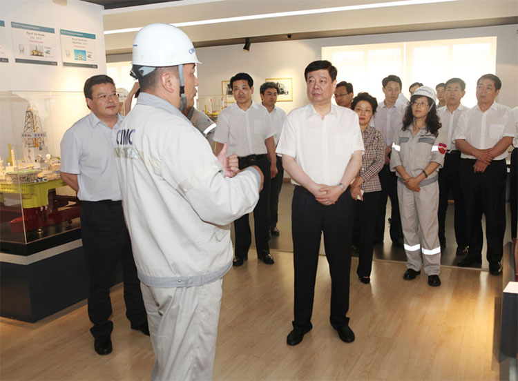 姜異康首先參觀了公司展廳,聽取了公司副總裁姜雋關于中集來福士廠區建設、在建項目以及中海油服興旺號、D90超深水半潛平臺等介紹。在深水碼頭,姜異康現場察看了GM4D深水半潛式鉆井平臺、D90超深水半潛鉆井平臺建造情況,并詳細聽取了項目負責人關于項目的技術參數、作業性能及建造進度的匯報。