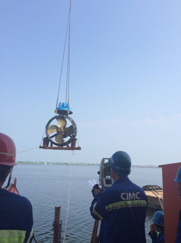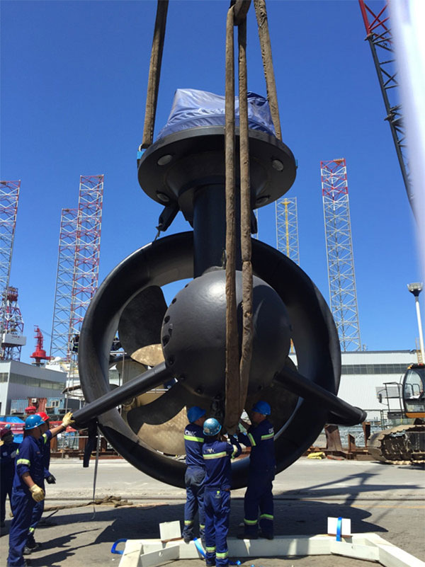 2015年8月20日下午,隨著最后一個推進器提升到位,“維京龍”推進器水下部分按計劃安裝完成。中集來福士煙臺基地深水碼頭水深達到18米,使推進器安裝能夠在岸邊完成,大大提高了安全性和經濟性。經過此前9座深水半潛式平臺推進器安裝,中集來福士已經形成了一套成熟的岸邊推進器安裝工藝,“維京龍”項目從安裝前材料準備到人員分配做到了井井有條,確保了安裝計劃的順利完成。