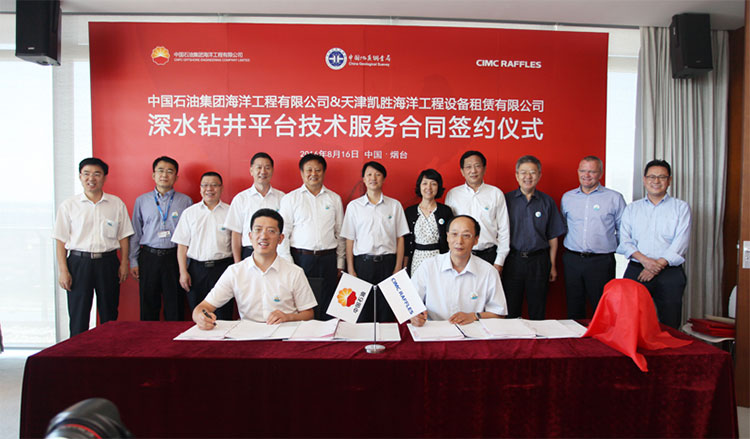 2016年8月16日,中國石油集團海洋工程有限公司(簡稱“中油海”)與煙臺中集來福士海洋工程有限公司(簡稱“中集來福士”)在煙臺簽署了D901#超深水鉆井平臺技術(shù)服務(wù)合同。中國石油集團公司總經(jīng)理助理王鐵軍、中油海總經(jīng)理劉圣志、中集集團副總裁于亞、中集來福士總裁王建中等出席簽約儀式。該平臺交付后,將為中油海提供海上能源勘探服務(wù)。