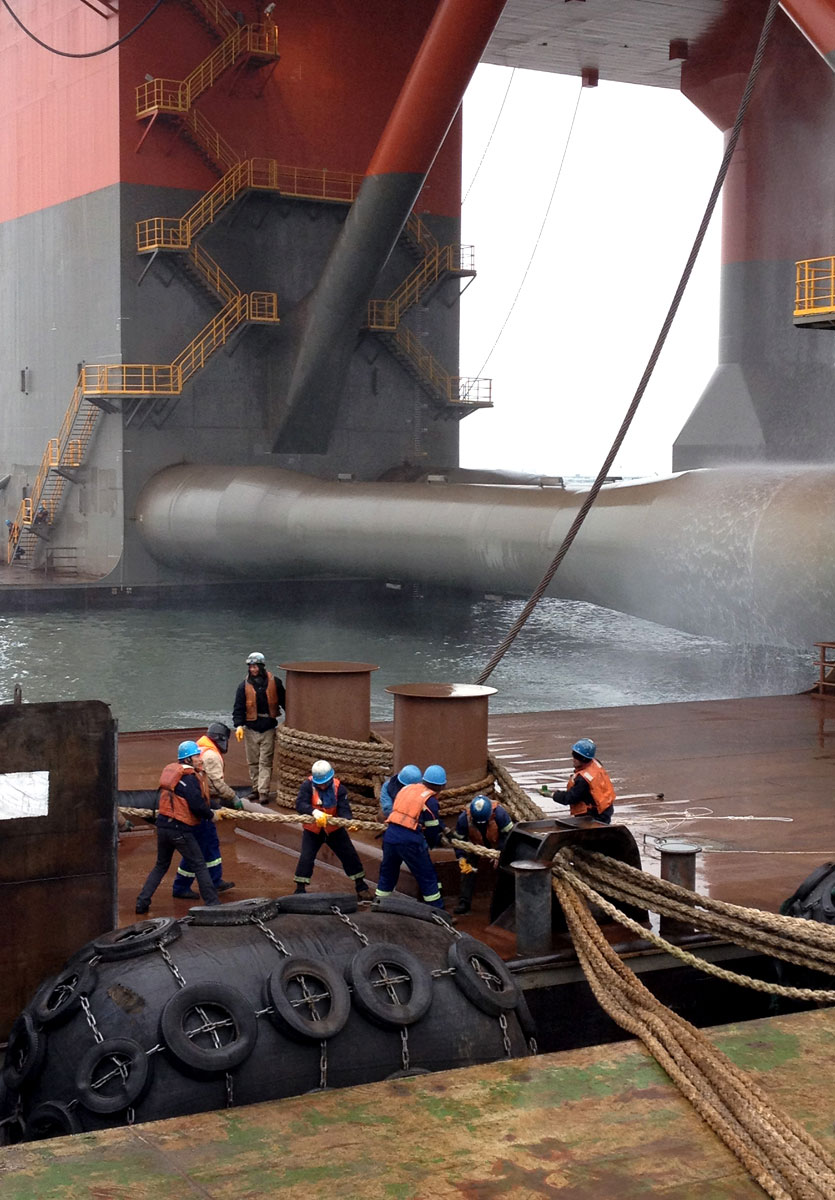 3月19號上午9點,由中集來福士自主研發設計、建造的深水半潛式起重生活平臺SSCV 206完成試航各項任務,在一條主拖輪和四條輔拖輪協助下,平穩地停靠在中集來福士深水碼頭。此次試航從3月14日14點始,總共歷時4天18個小時,較原定計劃提前了3天6個小時。試航期間,試航小組所有工作人員共同協作與努力,按照計劃滿足了ABS CIRCLEP的所有要求,先后進行了拋錨試驗、下潛試驗、震動噪音測試、壓載速度測試、諧波測試、磁羅經測試等工作。SSCV 206自3月15日早8點成功拋出第一個錨后,全程共拋出12個錨。本次成功試航為后續的各項工作奠定了基礎。
