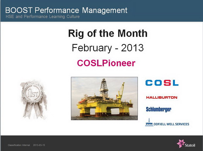 近日,中海油田服務股份有限公司(“公司”)半潛式鉆井平臺COSLPioneer在挪威國家石油公司(“Statoil”)對北海海域31座平臺的2月份綜合績效考核中榮登榜首,被評為“2月月度平臺”。Statoil對COSLPioneer平臺的管理系統、設備能力和后勤保障予以了充分肯定。