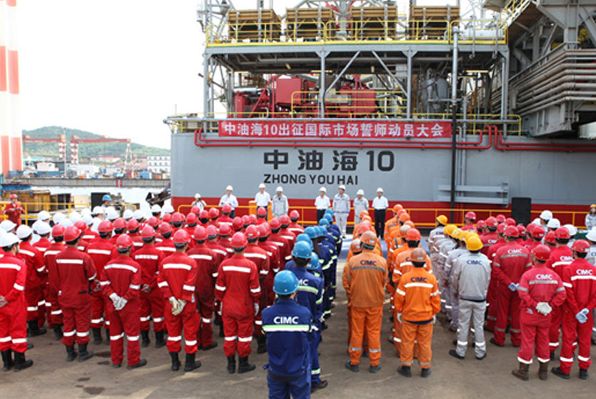 9月5日上午10時30分,中油海10平臺交付儀式在煙臺中集來福士2號碼頭舉行。出席儀式的有中油海總經理黃立功,副總經理張運通,總經理助理、鉆井事業部經理尹會存,總經理助理、安全副總監馬寶金,中集來福士總裁于亞,副總裁趙暉、劉燕嘉以及參與項目改造工程的工程技術人員80多人。